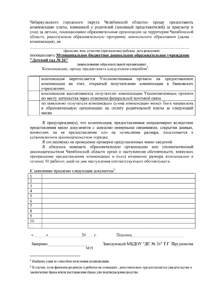 Заявление на компенсацию части родительской платы за присмотр и уход.
